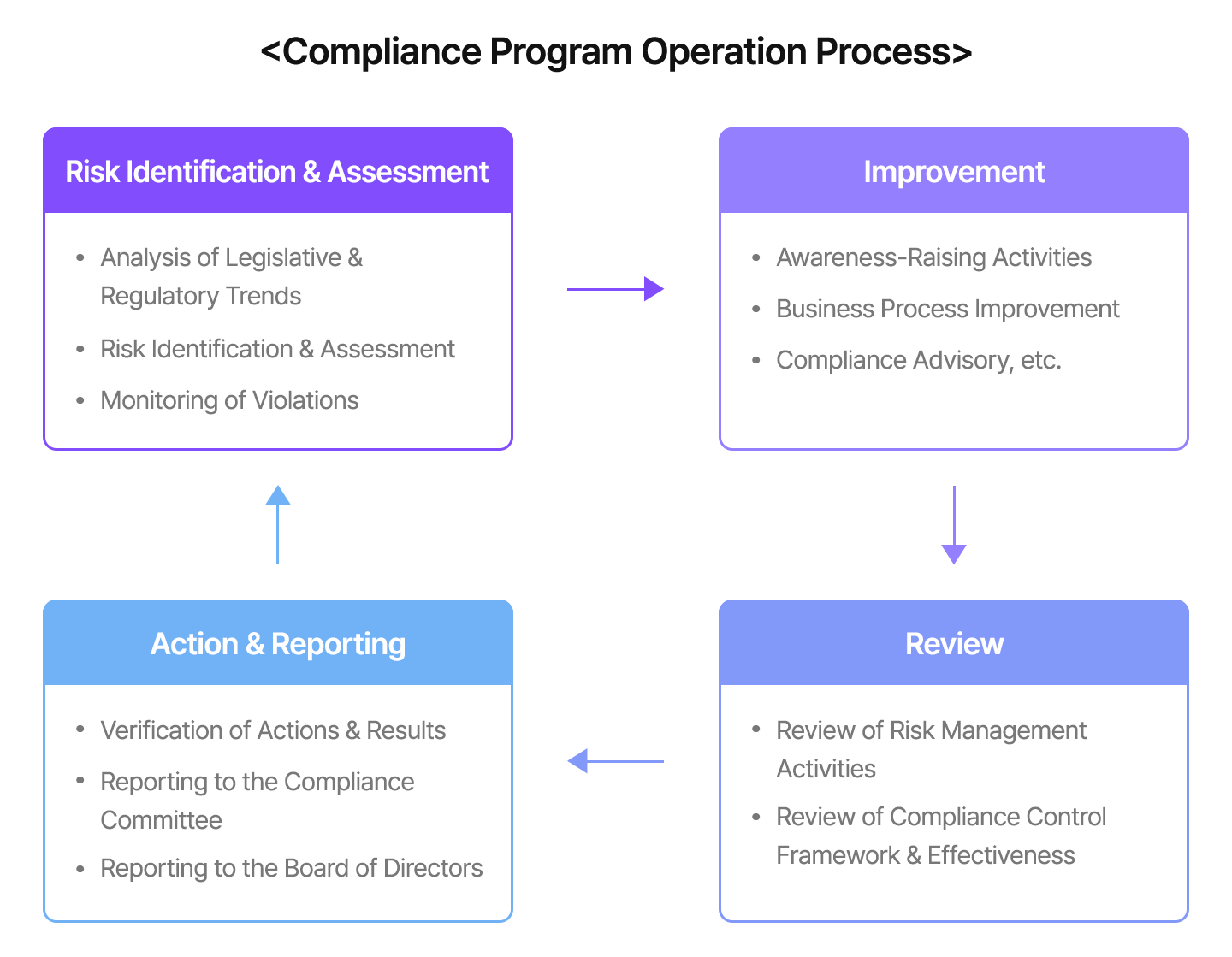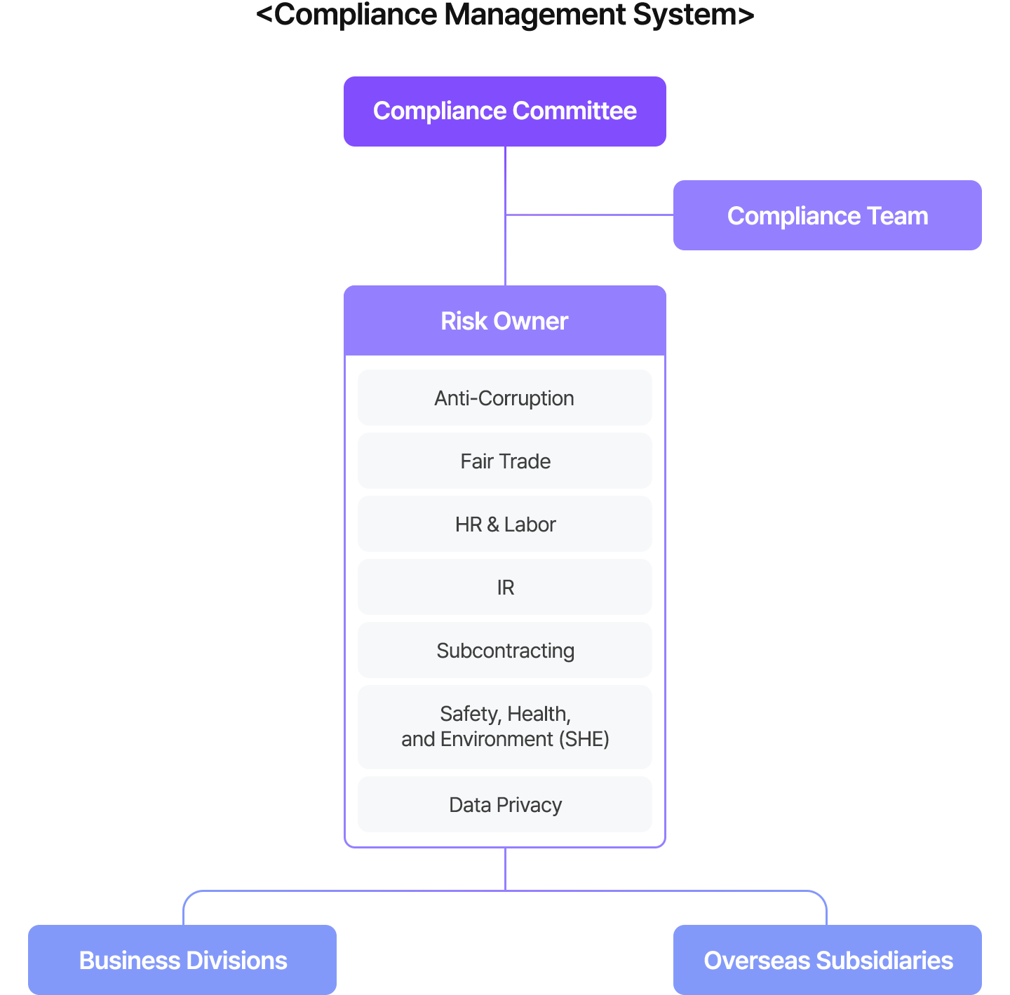 To proactively prevent and systematically manage compliance risks, LG CNS has established and operates a Compliance Committee under the leadership of the CFO. The Committee comprises Risk Owners from each domain, key executives, business unit planning teams, and overseas subsidiaries. It convenes quarterly to develop risk prevention plans, review progress, and discuss major compliance-related issues. The Compliance Team supports the effective operation of the compliance program by formulating related policies, managing the Committee, and promoting awareness internally. In addition, Risk Owners lead the development, execution, and enhancement of risk prevention measures across critical areas such as anti-corruption, fair trade, HR and labor relations, investor relations (IR), subcontracting, safety, health and environment (SHE), and personal data protection.