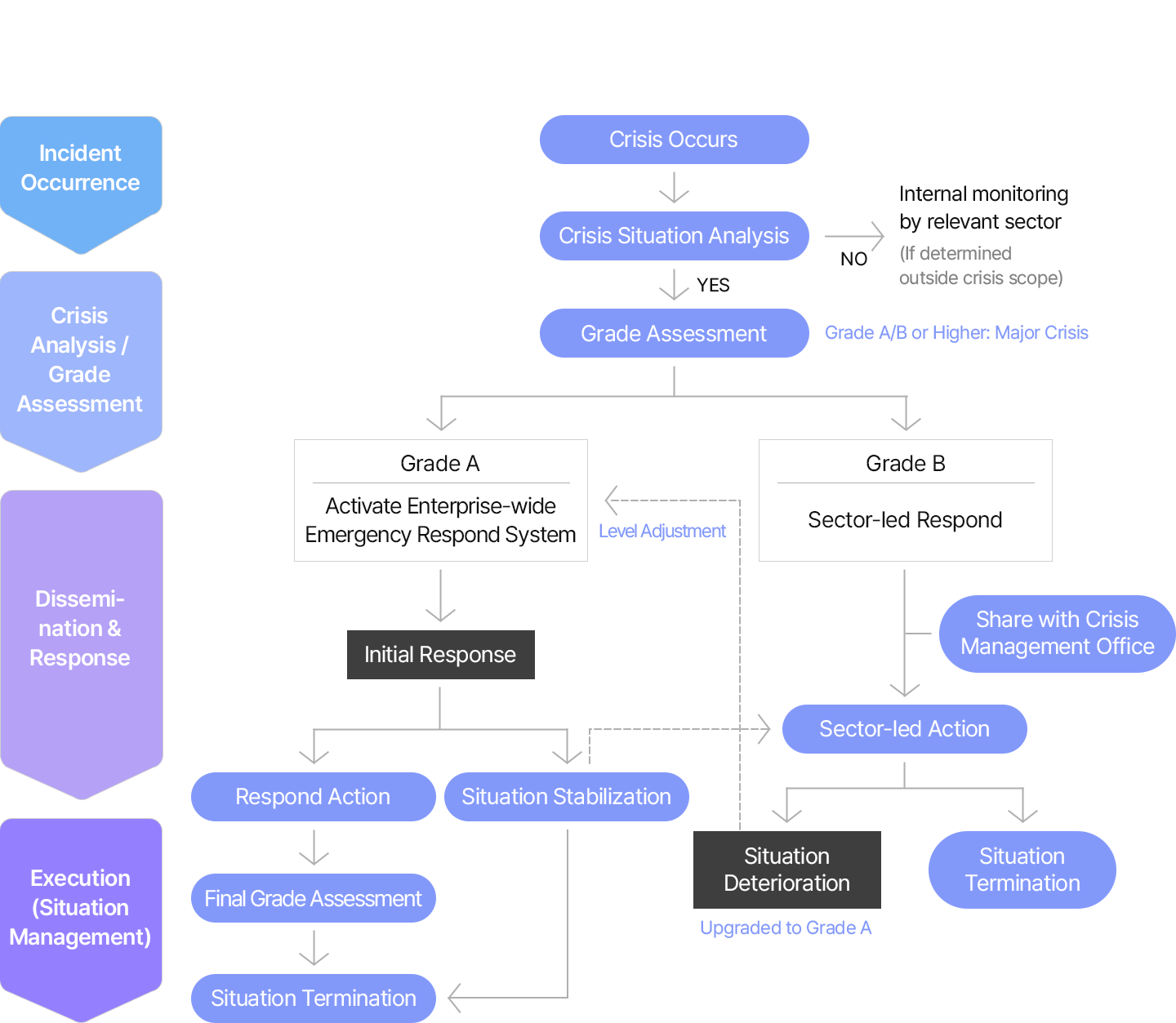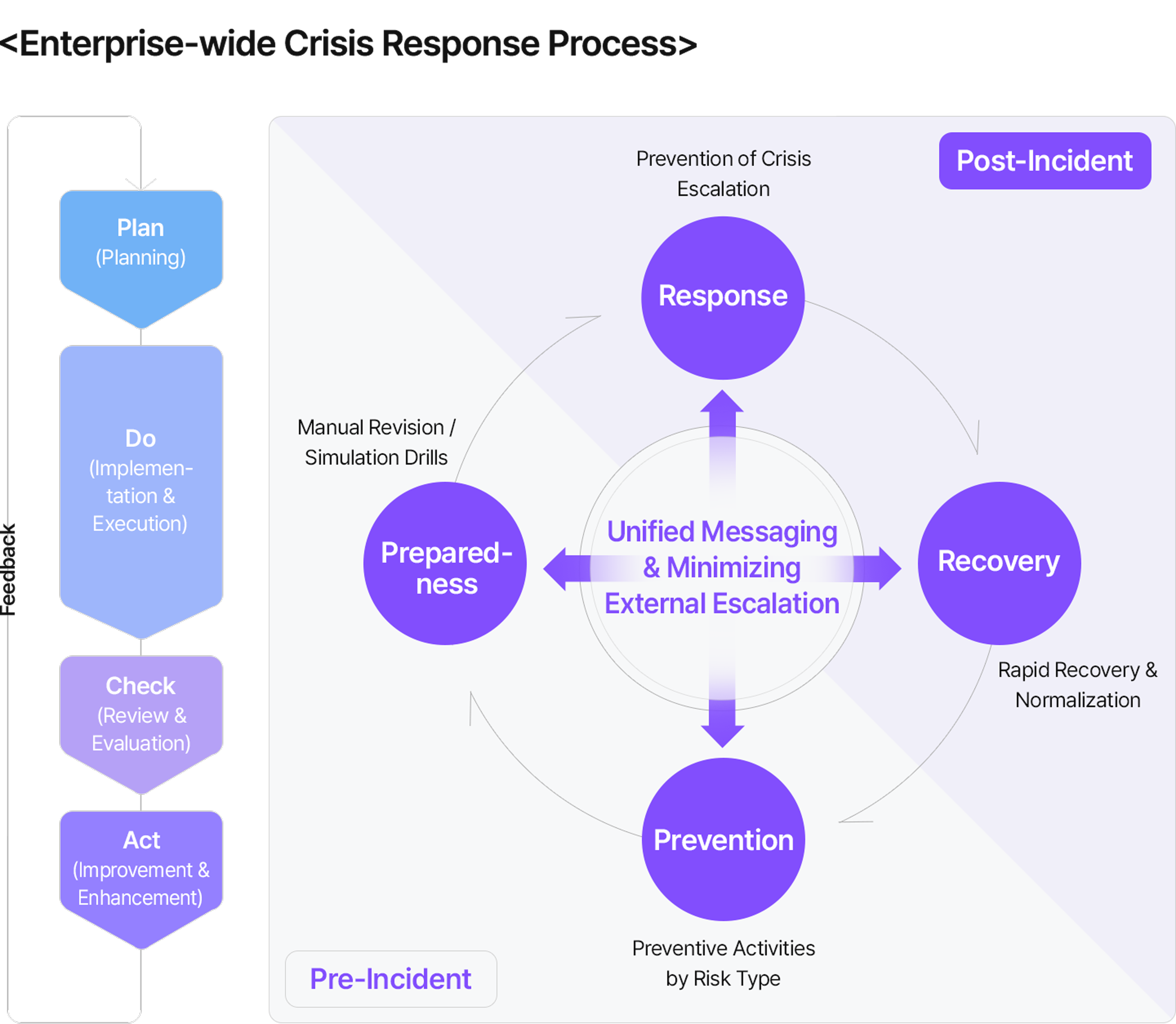 LG CNS operates an enterprise-wide crisis management process encompassing the full Plan-Do-Check-Act (PDCA) cycle, from prevention and response to recovery, based on the Group’s standard crisis management framework. Periodic simulation drills are conducted to ensure operational readiness and effectiveness. When a crisis occurs, the situation is immediately classified according to its severity. Depending on the scale, either an enterprise-wide or sector-specific response system is activated to implement phased actions, including initial response, situation stabilization, and stage adjustment, until the situation is fully resolved. This approach enables unified corporate messaging and rapid response at the enterprise level. It also clearly delineates roles among relevant organizations and promotes collaboration to minimize the risk of external escalation. After the crisis has been resolved, LG CNS conducts a root cause analysis and implements recurrence prevention measures to manage the process through to complete recovery. In parallel, continuous improvement initiatives based on lessons learned are also pursued.