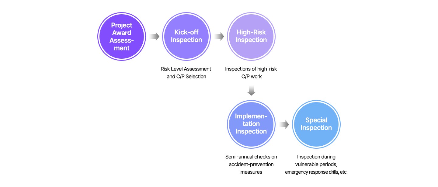 LG CNS conducts risk assessments that reflect the characteristics of each business site in order to reduce hazardous risk factors during work, using a high/medium/low evaluation method for construction projects and a checklist method for office-based roles. It also operates a safety inspection system by project stage and timing for construction projects where the risk of accidents is high. In addition, the company has established an “Accident Investigation and Countermeasure” process to minimize damage and prevent recurrence in the event of an incident.