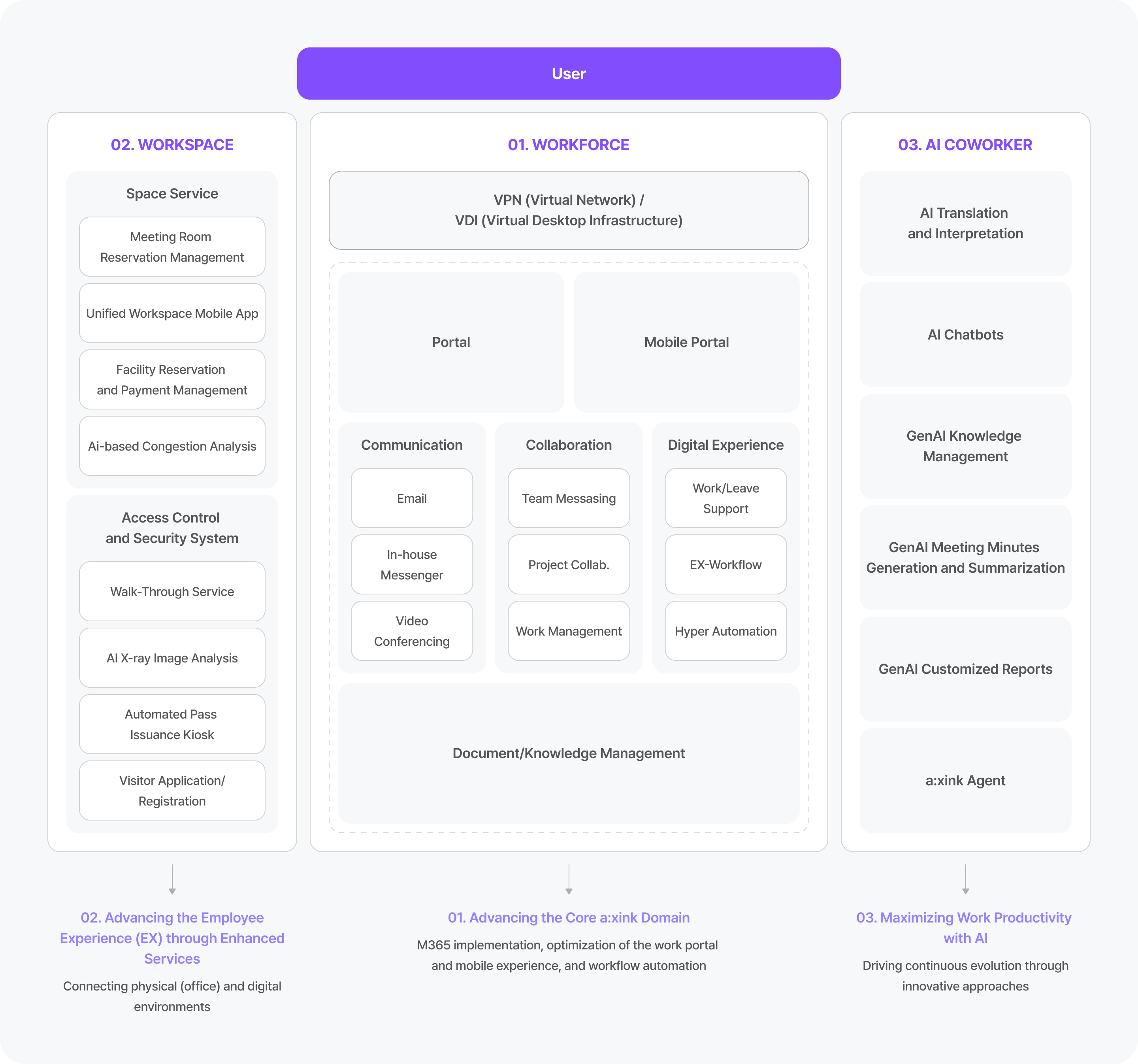 Starting around the year 2000 with the introduction of web-based intranets, smart work proliferated in the 2010s with mobile- and cloud-based platforms. COVID-19 led to the acceleration of DX adoption, and now adopting AX Work with AI, companies have steadily enhanced productivity through digital innovations. This evolution serves as a catalyst for efficiency in employees’ work methods, supporting corporate sustainability and workplace innovation. In these new circumstances, there is a need to shift to an Employee Journey–based work environment that boosts productivity, engagement, and connectedness for employees.