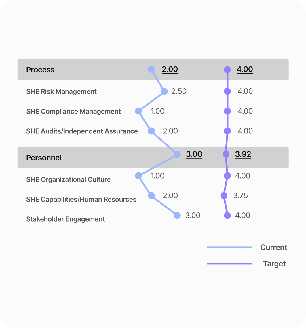 We provide comprehensive diagnostics of your organization's safety environment maturity across governance, technology, process, and people. By analyzing the current condition and comparing it against target benchmarks, we diagnose the level of digitalization in your safety management and present a prioritized, phased roadmap for future improvements.