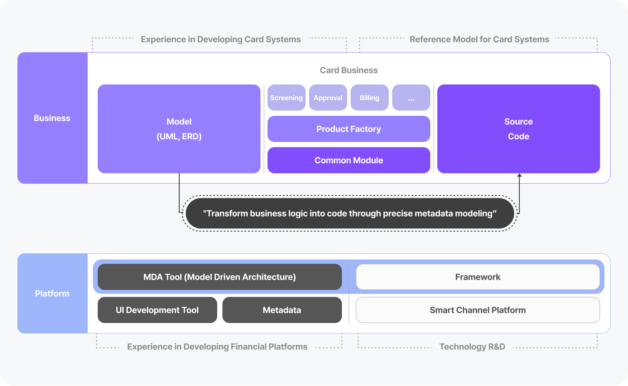 LG CNS CardPerfect is a business development platform built on best practices, integrating business solutions, frameworks, and development tools into an all-in-one solution.