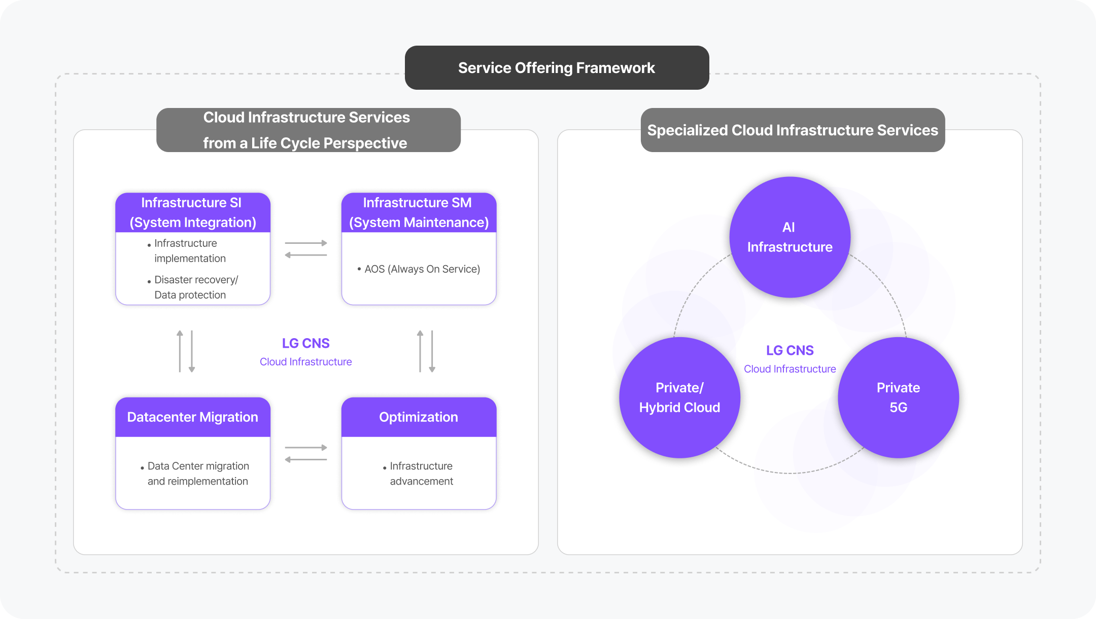 As the no. 1 cloud infrastructure partner, LG CNS leads clients' digital transformation(DX) through its unparalleled technology and extensive cross-industry experience. LG CNS' cloud infrastructure services deliver end-to-end infrastructure management across the IT lifecycle, including infrastructure SI (System Integration), SM (System Maintenance), optimization, and migration. Notably, it offers specialized infrastructure services, boasting deep expertise in areas such as AI infrastructure, Private/Hybrid Cloud, and Private 5G.