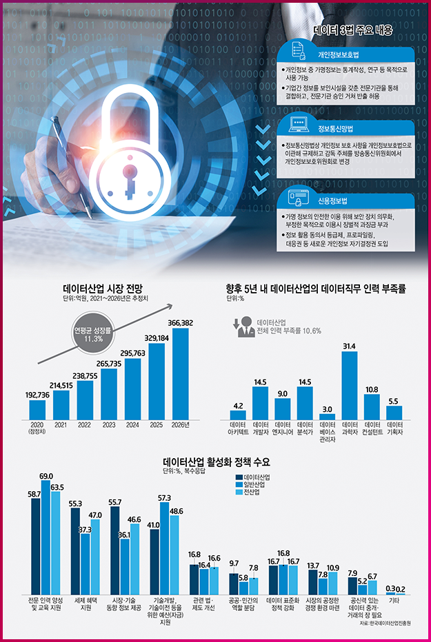 데이터 관련 업계는 데이터 3법 시행뿐만 아니라 데이터 사업이 전반적으로 늘어나면서 호황기를 맞았는데요. 한국데이터산업진흥원에 따르면 우리나라 데이터산업 시장은 2년 내로 36조 원까지 성장할 것으로 전망합니다. 성장기를 맞은 금융 서비스 및 데이터 산업 육성을 위해서는 복잡하게 얽힌 디지털금융법을 명확히 하고, 동시에 인력양성과 기술개발 등 다양한 지원책이 제공될 필요가 있습니다.