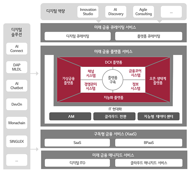 둘째는 미래금융 플랫폼 서비스입니다. 플랫폼 구축과 IT 현대화가 결합한 형태의 서비스인데요. 비즈니스 변화에 민첩하게 대응하고, DX 신기술을 활용해 플랫폼 비즈니스를 제공하는 구축 서비스를 제공해 금융사 스스로 DX 여정을 주도할 수 있도록 IT 기반을 전환하는 애플리케이션 현대화(AM) 서비스를 제공합니다.