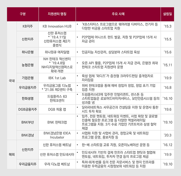 먼저 대형 금융사 중심으로 핀테크 랩을 통한 유망 기업 발굴이 급증하고 있는데요. 신한금융지주는 2015년 5월 신한퓨처스랩을 출범해 총 282개 스타트업을 육성하고, 600억 원에 달하는 투자를 단행했습니다. 지난해에는 핀테크, 빅데이터, 블록체인, AI, 프롭테크 등 기술력을 보유한 20개 회사를 선발하고 사무공간 대여는 물론 직간접 투자, 법률 자문, 인재 채용 등을 지원하고 있습니다. 또한 2016년에는 국내 최초로 베트남 호치민에 스타트업 육성을 위한 핀테크랩을 설립했고, 지난해에는 하노이 사무소를 개소하는 등 국내외를 넘나들며 스타트업 육성 행보를 보이고 있습니다.