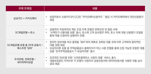 KB국민카드는 온라인 담보대출 플랫폼 담비와 전세보증금 반환보증 제휴를 맺고 상품을 선보였습니다. 전세 대출을 보유한 고객이 늘어남에 따라 대출 비교에 특화된 핀테크사와 전통 금융사가 제휴를 맺는 사례입니다. SC제일은행은 토스와 소액단기 신용대출 상품을 출시했습니다.