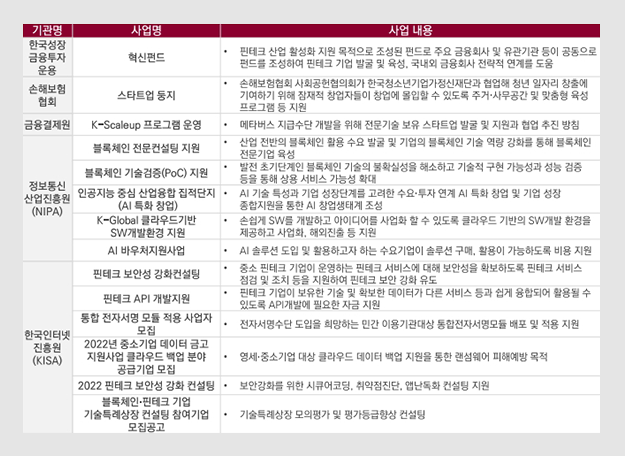 한국성장금융은 혁신펀드로 핀테크 산업 활성화를 지원하며, 한국인터넷진흥원(KISA)도 지난해 6월 국민은행과 블록체인, 핀테크 스타트업 기술사업화를 공동 지원하는데 발 벗고 나섰습니다. 특히 한국인터넷진흥원은 과학기술정보통신부와 스타트업을 대상으로 대기업 협업을 통한 사업화 기회 마련에도 앞장서고 있습니다.