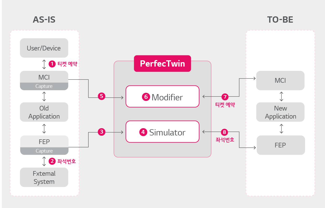 PerfecTwin은 먼저 현행 FEP(Front-End Processor, 입력되는 데이터를 컴퓨터 프로세서가 처리하기 전에 미리 처리해 프로세서의 처리 시간을 줄여주는 프로그램 또는 하드웨어) 거래 메시지를 캡처해 시뮬레이터(Simulator, 복잡한 작동 상황 따위를 컴퓨터를 사용해 실제 장면과 같도록 재현하는 장치)에 저장하고, 현행 예약 서비스 사용자의 거래를 캡처 및 재현합니다. 신규 예약 서비스가 개통되기 전이기 때문에 실제 외부 시스템에 요청을 전송할 수는 없지만, 시뮬레이터에 사용 가능한 좌석을 요청하면 현행 FEP 거래 메시지와 동일한 좌석 번호 3A를 반환합니다. 또한 신규 예약 서비스는 현행 예약 번호 100이 아닌, 새롭게 생성된 예약 번호 91을 예약 완료 메시지로 반환하게 됩니다.