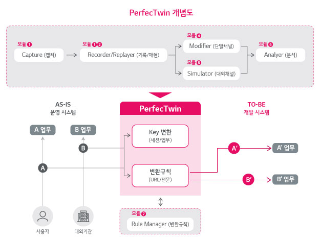 그렇다면 시스템 개통 전에 잠재 결함을 모두 파악해 제거할 수 있는 방법은 없을까요? DX전문기업 LG CNS는 이를 가능하게 하는 새로운 테스트 접근 방식, ‘PerfecTwin(퍼펙트윈)’을 개발했습니다. PerfecTwin은 높은 완성도를 뜻하는 ‘Perfect’와 실제 데이터를 똑같이 적용한다는 의미의 ‘Twin’을 결합한 단어인데요. 현행 시스템에서 처리되는 실제 트랜잭션(Transaction, 처리되는 특정한 업무, 특정한 거래, 또 그 결과 얻어지는 데이터 기록)을 신규 시스템에서 자동 재현하고 테스트해, 기존의 테스트 방식을 극복하고 잠재 결함을 사전에 제거할 수 있게 도와주는 실거래 자동 검증 솔루션입니다.