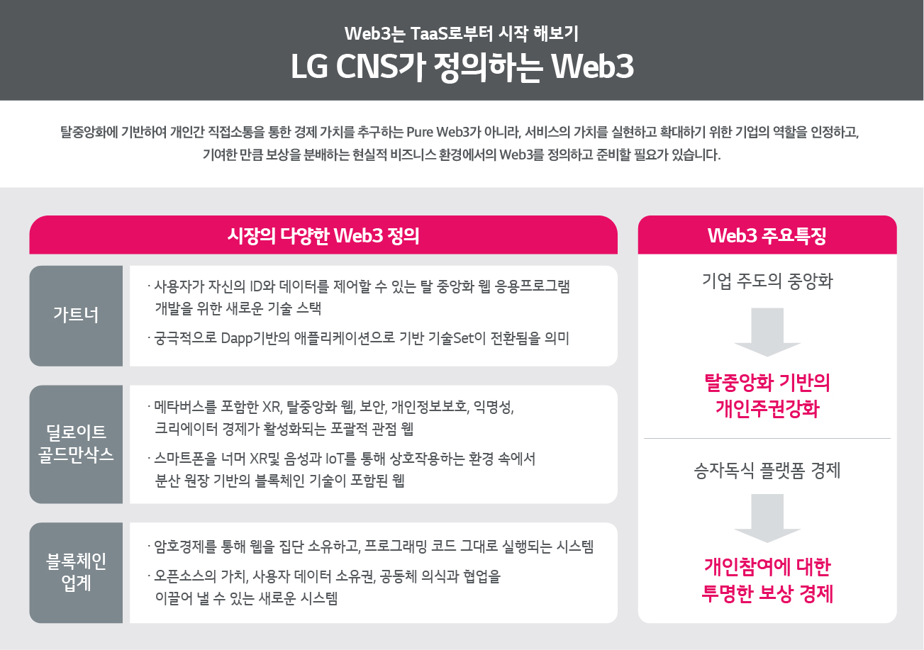 블록체인 기술 중에서도 토큰은 과거 비트코인, 이더리움 등 투자로 활용되던 것을 넘어, 본격적으로 비즈니스 용도로 활용될 것입니다. 특히 금융 외 다양한 분야에서 실물 자산, 데이터, 디지털 증명 등의 토큰 화가 이뤄질 가능성이 높습니다. 앞서 언급한 NFT나 DID처럼 블록체인 애플리케이션이 실생활에 가깝게 와 있는 만큼, 관련 기술을 빠르게 구축하도록 돕는 인프라 기술의 가치는 더욱 높아질 전망입니다. LG CNS도 다양한 블록체인 서비스로 웹 3.0 기반 생태계에서 리더십을 발휘하고 파트너들의 성장을 도울 예정입니다.