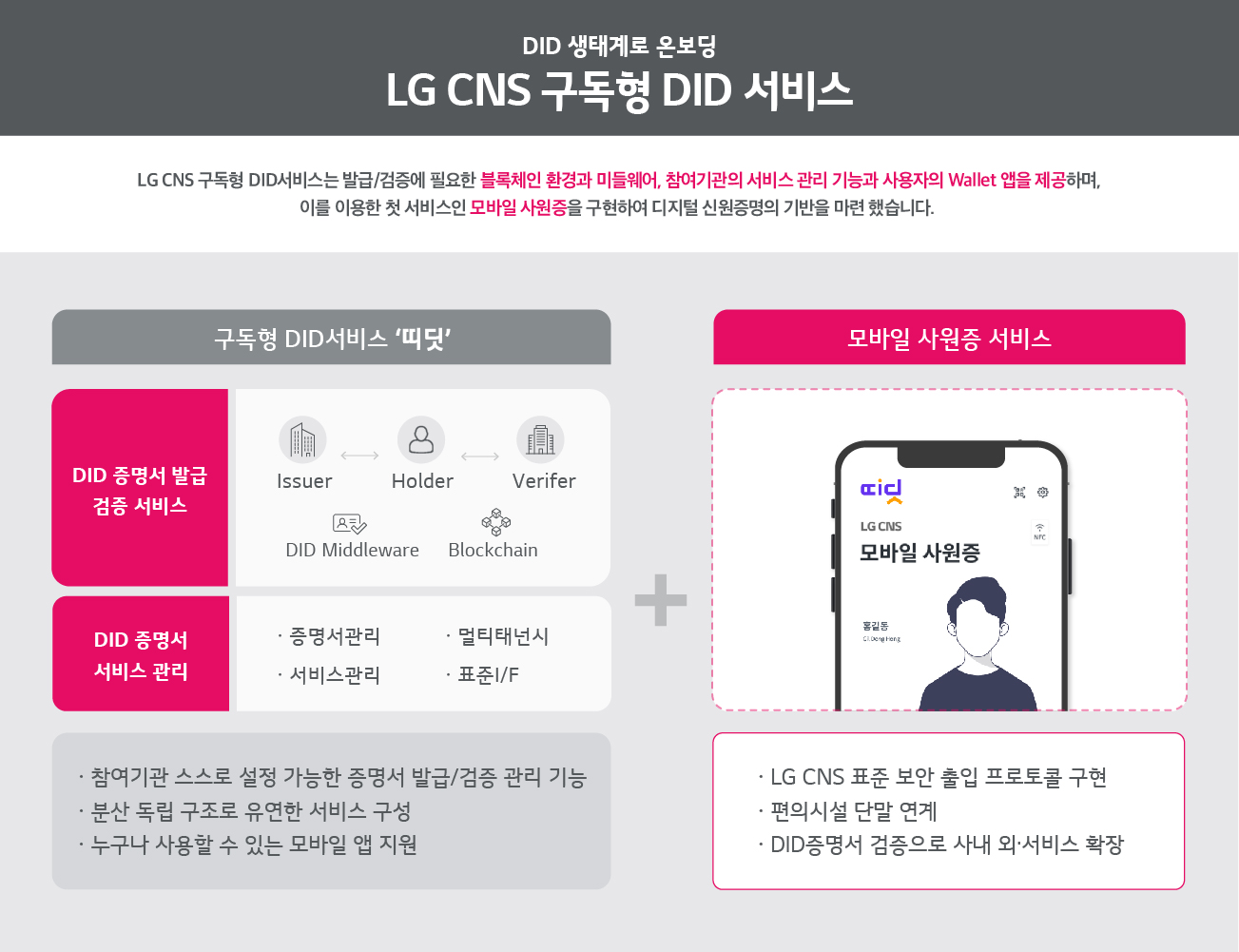 이처럼 LG CNS는 모바일 사원증을 시작으로 직원 결제나 전자서명 서비스까지 업무 지원 서비스를 확대할 예정입니다. 나아가 메타버스, 스마트시티에 디지털 신원 증명을 적용해 신뢰 기반의 온라인 커뮤니케이션 환경을 구축할 계획입니다.