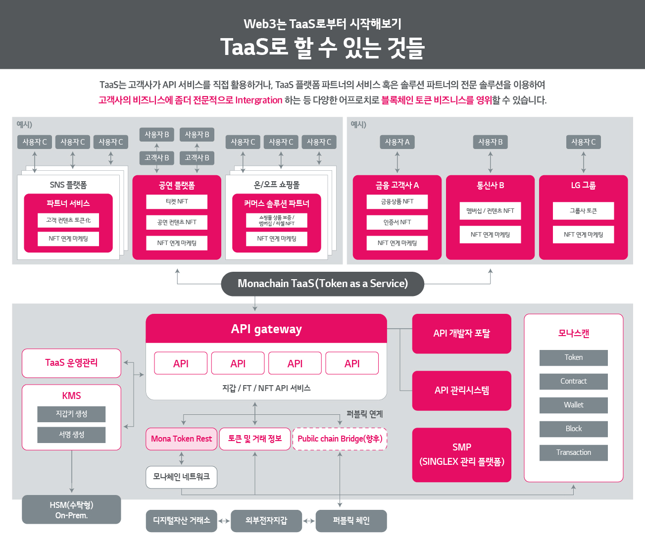 LG CNS의 모나체인 TaaS는 모나 토큰을 기반으로, 토큰 활용 비즈니스 개발을 지원하는 API(Application Programming Interface, 응용프로그램과 운영체제의 통신을 쉽게 하기 위한 연결 인터페이스) 서비스와 보안성 및 안전성을 높이는 기능을 지원합니다. 금융, 통신, 유통 등 다양한 산업 군에서 TaaS의 API를 활용해 서비스를 개발할 수 있습니다. 또한 TaaS 플랫폼 및 솔루션 파트너의 전문 기술을 통해 원하는 기능을 통합할 수도 있습니다.