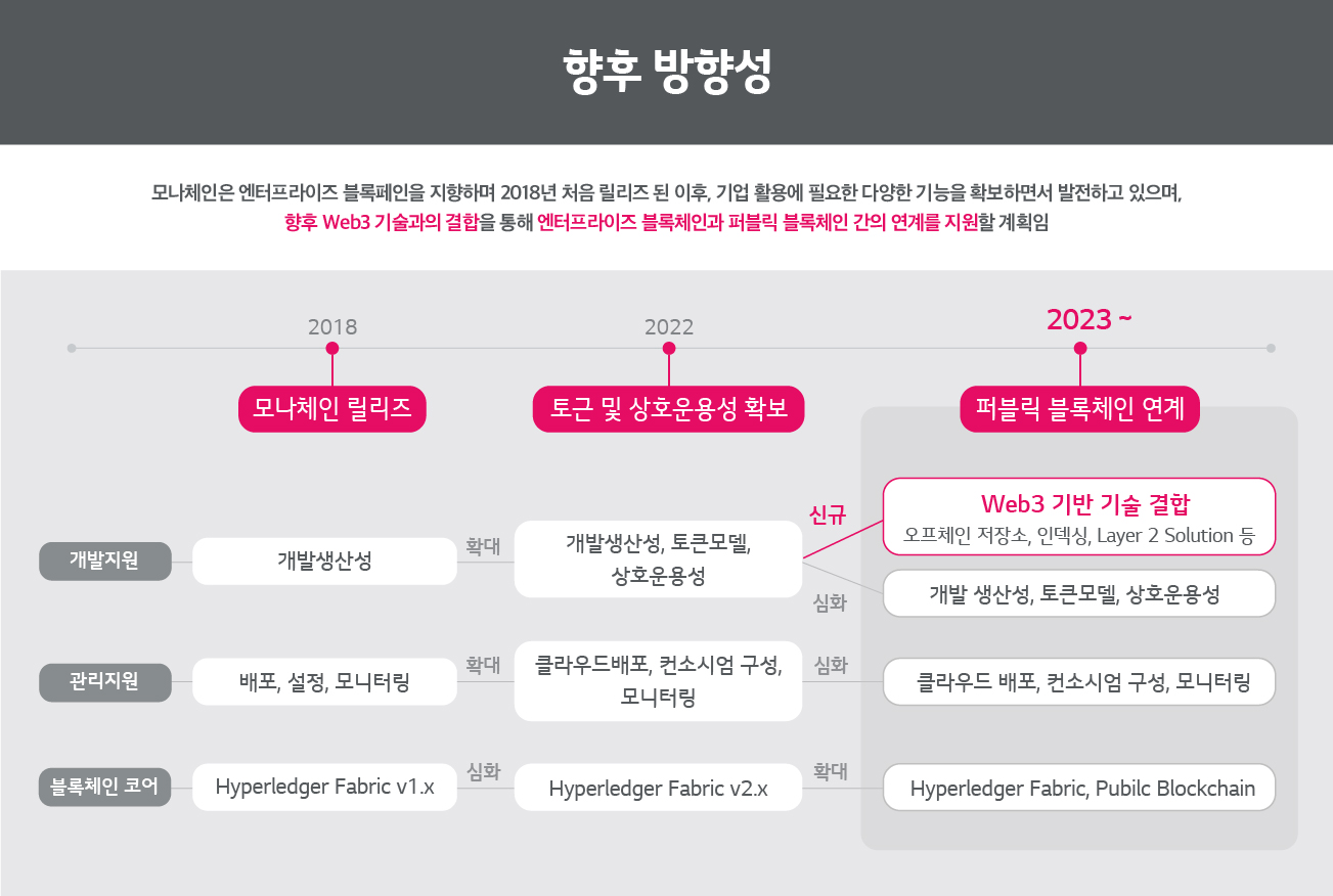 미국 IT 정보 기술 시장조사업체 가트너는 블록체인과 웹 3.0 기술 결합에 주목하고 있습니다. 가트너는 블록체인 분야에서 비즈니스 생태계가 확장될 수 있다고 보고, ‘향상된 서비스형 블록체인(Enhanced Blockchain as a Service, eBaaS)’ 기술을 강조했습니다. 프라이빗 엔터프라이즈 블록체인 기술력 기반으로 퍼블릭 블록체인까지 지원할 수 있는 업체를 선택해야 한다고 조언하기도 했습니다. LG CNS도 모나체인을 통해 엔터프라이즈 블록체인과 퍼블릭 블록체인 간의 연계를 지원할 계획입니다.