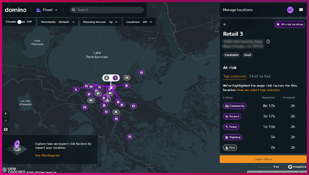 원 컨선은 각종 데이터를 분석해 사고 발생 시 대비책을 미리 마련할 수 있도록 각종 시뮬레이션을 제공합니다. 예를 들어, 7일 동안 홍수가 발생해 전력망이 중단될 경우, 기업에게 어떤 피해가 직간접적으로 발생하는지 알려주는 것입니다. 이러한 데이터를 기반으로 기업은 사고 예방을 위해 비용을 투입할 수도 있고, 공장이나 에너지 공급원의 위치를 분산화하는 등의 결정을 내릴 수 있습니다. 또한 피해 예방을 위한 투자금과 향후 피해로 인한 손실액을 비교 분석해 어떤 방식이 나은지 판단하고, 미래 전략을 다양하게 모색할 수 있습니다. 원 컨선이 제공하는 데이터 분석 및 시뮬레이션 기술은 일반 기업뿐만 아니라 금융 업계에서도 높은 관심을 받고 있는데요. 기업 및 부동산 투자 가치를 다방면으로 확인할 수 있고, 재해로 인한 보험금 지급 구조에 영향을 줄 수 있기 때문입니다.
