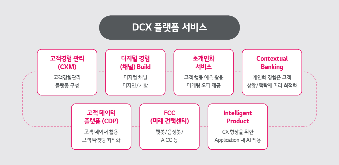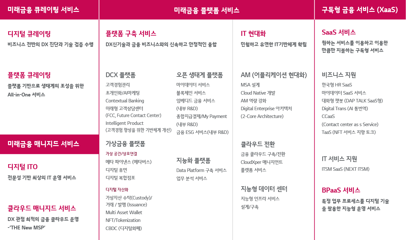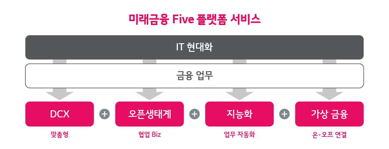 LG CNS는 금융사가 신속하고 안정적으로 업무를 할 수 있도록 DX 신기술을 접목한 ‘미래금융 Five 플랫폼 서비스’를 제공하고 있습니다. 미래금융 Five 플랫폼 서비스는 디지털 혁신의 중심이 되고 있는 △ DCX(Data Driven Customer eXperience, 디지털 고객 경험) △오픈생태계 △지능화 △가상금융 플랫폼 구축 서비스와 함께 IT 현대화 서비스를 제공합니다.