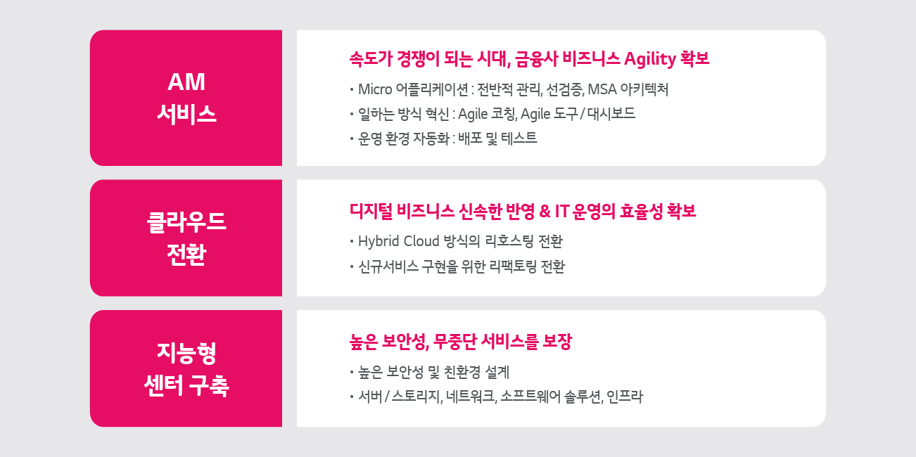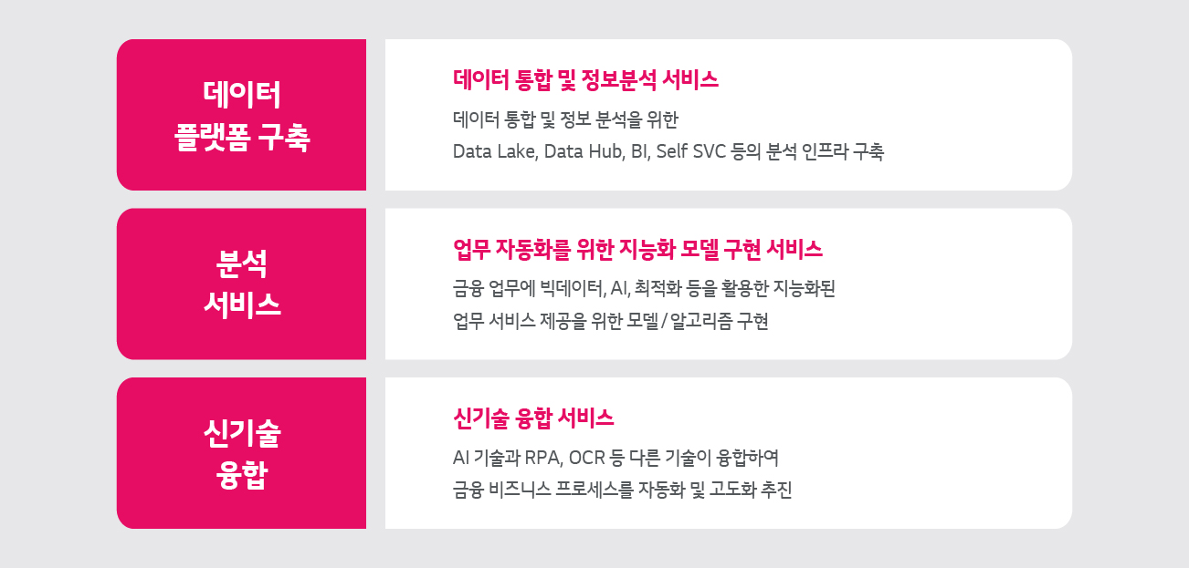 LG CNS는 금융사의 비즈니스 특화 서비스부터 AI, 클라우드 등 신기술 및 아키텍처 특화 솔루션까지 제공하고 있습니다. 또한 업계 전문가 조직을 통해 지속적으로 품질 고도화를 진행하고 있습니다.