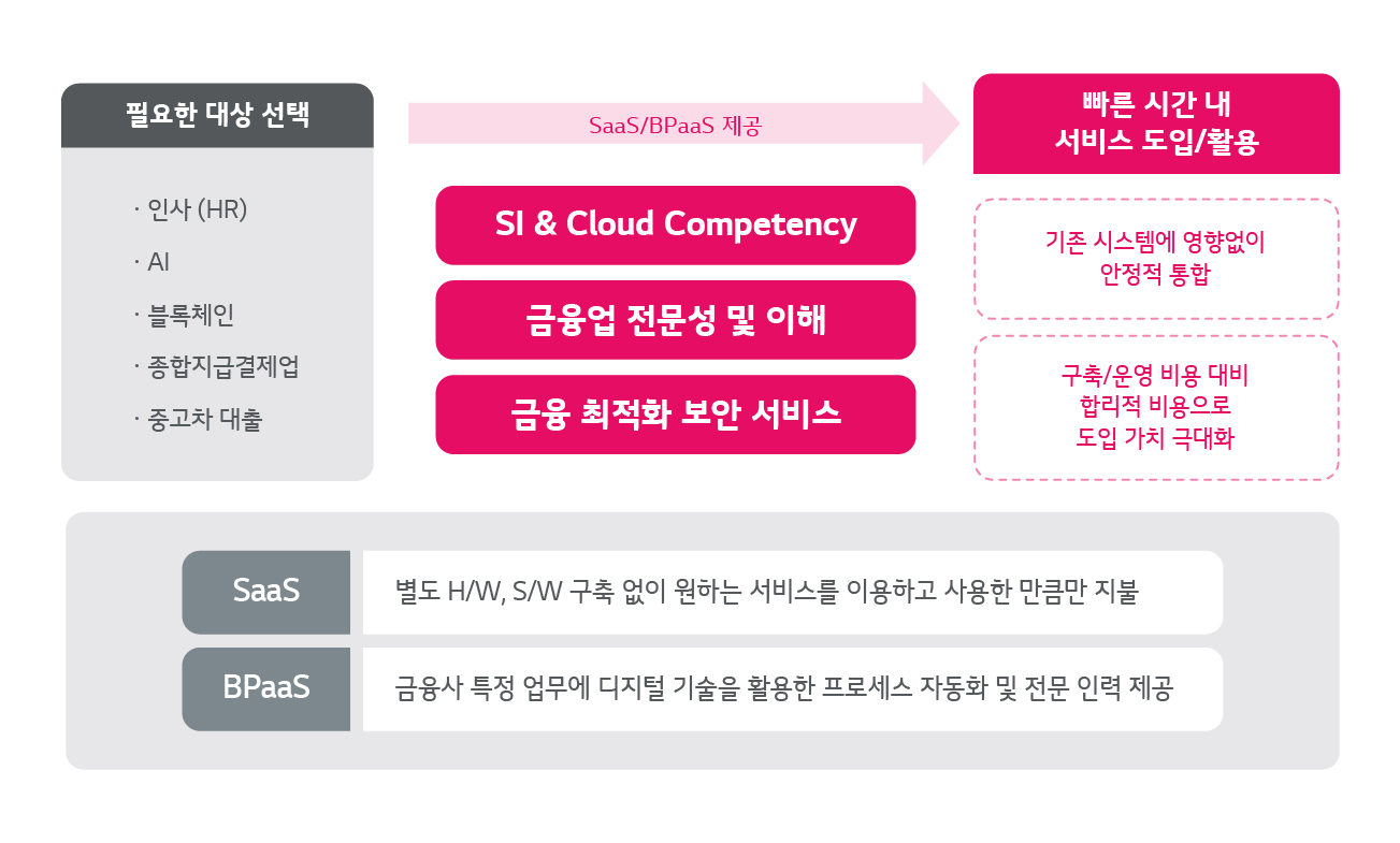 구독형 금융 서비스는 급변하는 DX 환경에 민첩히 대응해 최신 전문 시스템을 활용하고, 플랫폼을 사용한 만큼만 비용을 지불하도록 하는 서비스입니다. △SaaS(Software as a Service)형 서비스 △BPaaS(Business Process as a Service)형 서비스로 구성되어 있습니다.