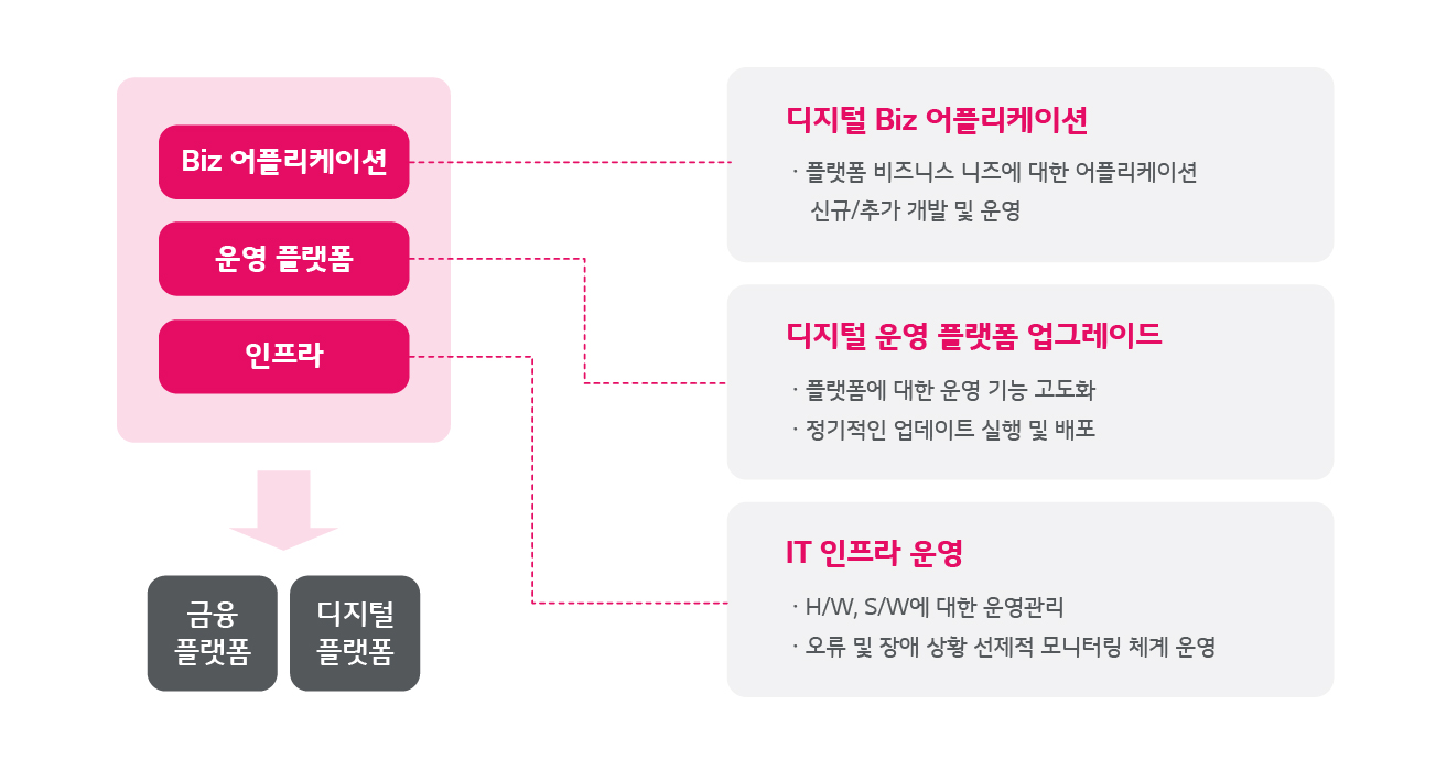 디지털 ITO 서비스는 전문성을 기반으로 금융사의 애플리케이션, 디지털 플랫폼, IT 인프라에 대한 운영 및 관리 서비스를 제공합니다. 안전한 금융 거래를 보장하면서도 새로운 디지털 플랫폼에 대해 유연하고 민첩한 대응이 가능하도록 운영, 관리 서비스를 제공합니다.