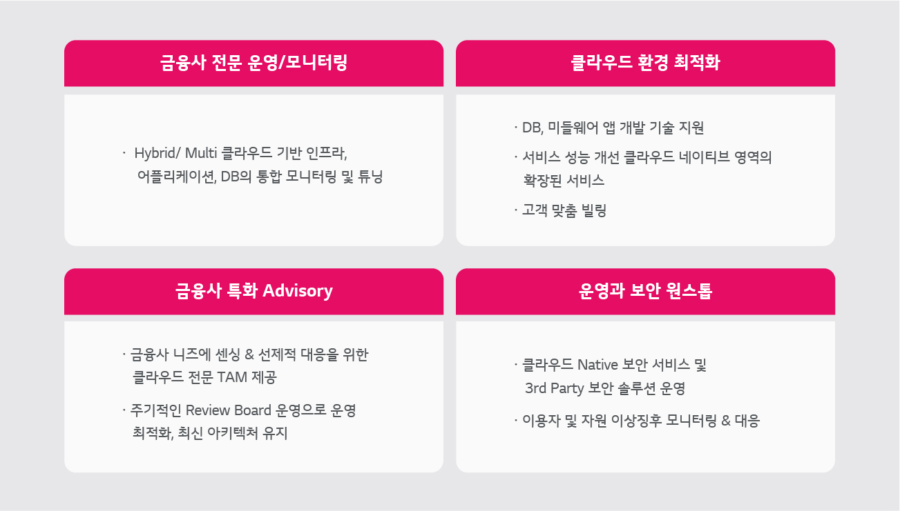 클라우드 매니지드 서비스는 클라우드 기반으로 금융사에 최적화된 하이브리드 형태의 운영 및 관리 서비스를 제공합니다. 금융사 클라우드 환경에 최적화된 안정적인 서비스 운영을 위해 다음과 같은 서비스를 제공합니다. 금융사 전문 운영 및 모니터링, 클라우드 환경 최적화, 금융사 특화 어드바이저리, 운영 및 보안 원스톱 서비스 등입니다.