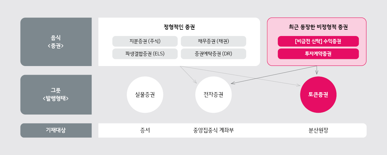 금융위원회에서는 토큰 증권의 개념을 음식과 그릇에 비유해 설명하기도 했는데요. 증권을 ‘음식’, 증권의 발행 형태를 ‘그릇’이라고 표현했습니다. 그릇이 달라진다고 해서 안에 담긴 음식이 바뀌지 않는 것처럼, 발행 형태가 달라진다고 해서 증권이라는 본질이 변하는 것은 아닙니다. 그러나 아무 그릇이나 음식을 담는 그릇으로 쓸 수 없고, 음식 종류에 따라 사용하기에 적합한 그릇도 달라지죠. 토큰 증권이 기존 전자 증권이 아닌 새로운 발행 형태가 필요하게 된 것처럼 말입니다.
