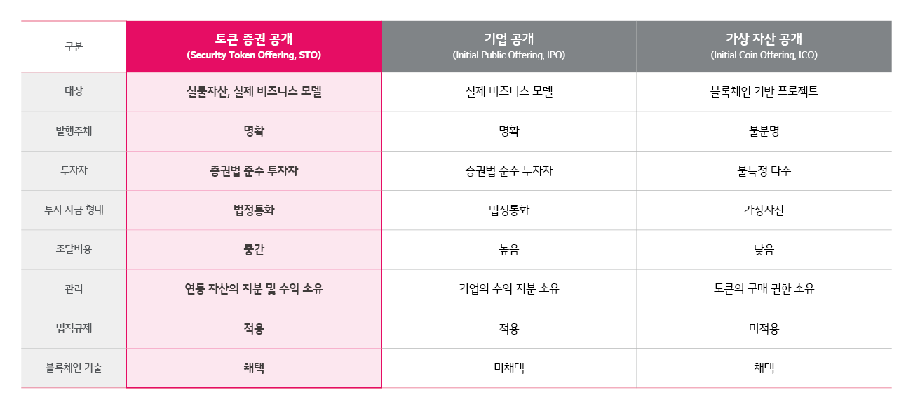 토큰 증권이 신설되면서 토큰 증권을 발행, 유통할 수 있는 STO가 허용됐는데요. 아래 표는 STO와 기존 IPO(Initial Public Offering · 기업 공개), ICO의 차이를 비교한 자료입니다.