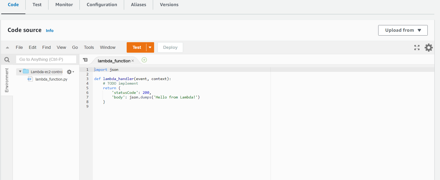 위의 내용을 수행하고 나면 아래와 같이 코드는 없는 케이스 형태의 Lambda가 생성됩니다. 이제 코드를 넣을 때입니다.