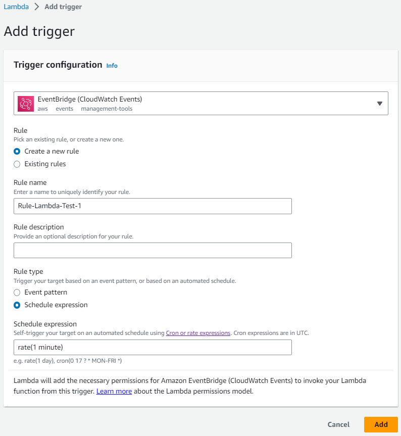 따라서 trigger는 시간 스케쥴링이 가능한 EventBridge입니다. Trigger의 등록은 아래 그림과 같이 람다 메뉴에서도 생성할 수 있고, EventBridge 서비스 콘솔에서도 생성할 수 있습니다.