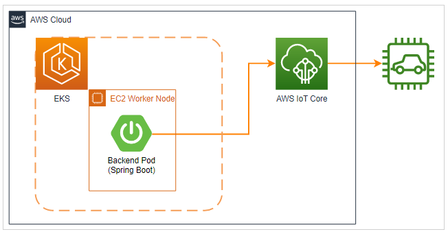 개발 환경은 Spring boot로 개발된 Backend Pod가 EKS on EC2로 기동 중이었으며, Backend에서 IoT Core를 통해 IoT Device에 Rule을 내리는 기능이 개발 중이었습니다.
