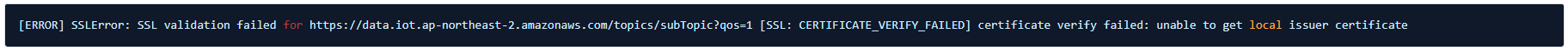 위의 에러는 Backend에서 IoT Core로 API 통신을 위해 Endpoint로 연결을 시도 중, SSL: CERTIFAICATE VERIFY FAILED 가 발생한 것입니다.