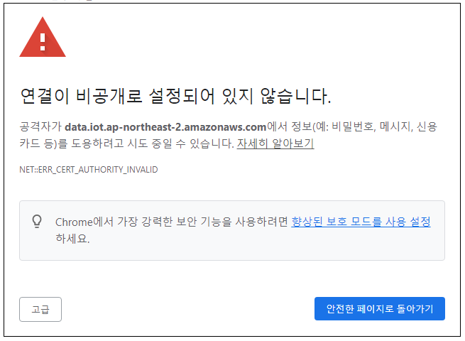 해당 엔드포인드에 접근해 보니 다음 그림과 같이 신뢰하지 않는 인증서였습니다.