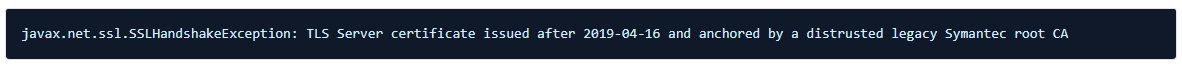 이를 Hedge 할 방법으론, java.secure 파일에서 ‘jdk.security.caDistrustPolicies=SYMANTEC_TLS’ 옵션을 제거(주석) 하는 것입니다.