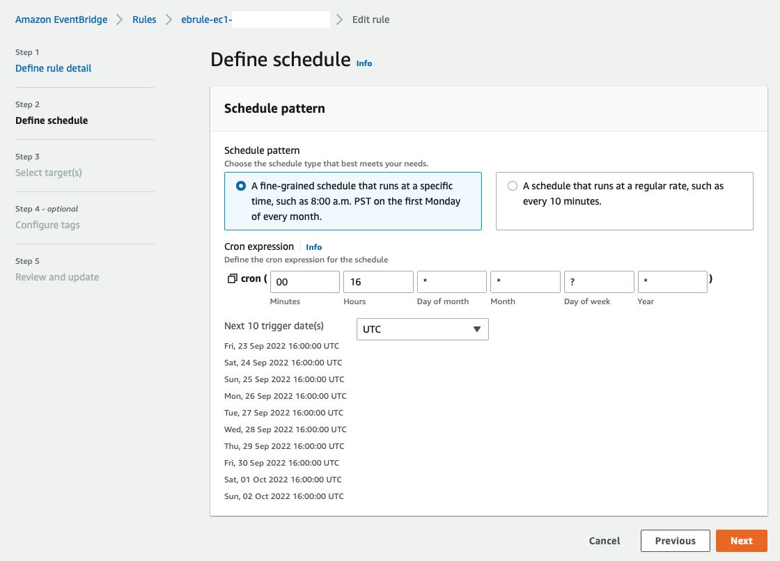 EventBridge는 다음과 같이 Cron 형식으로 스케쥴을 지정하여 동작 시킬 수 있습니다.