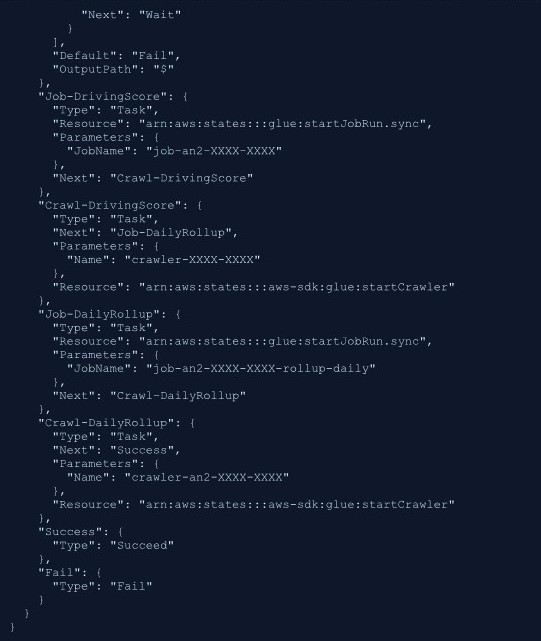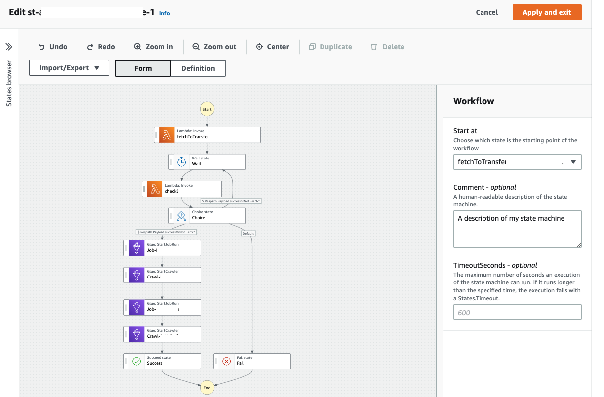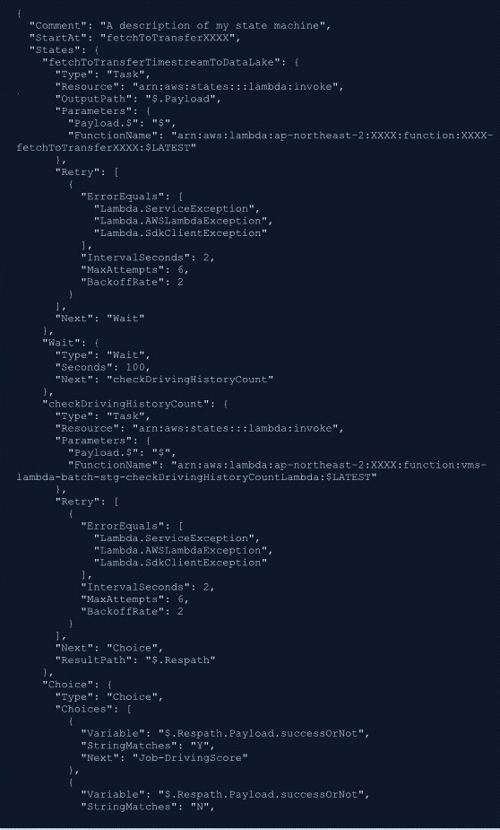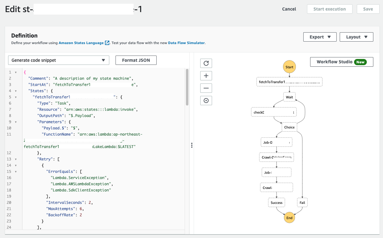 State Machine은 위 그림과 같이 Workflow Studio GUI를 통해 Drag&Drop으로 쉽게 작성하거나 아래 그림과 같이 JSON 포맷으로 직접 수정할 수도 있습니다.