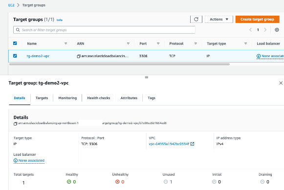 데모환경에서는 Target Group의 Target은 RDS Instnace IP 입니다.