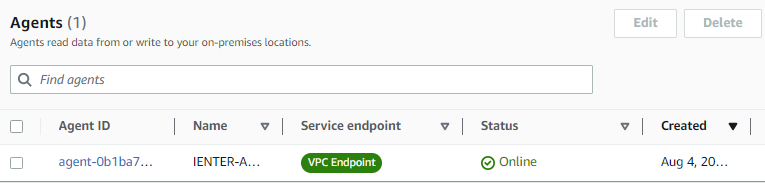 Datasync 좌측 메뉴에서 Agent를 선택합니다.