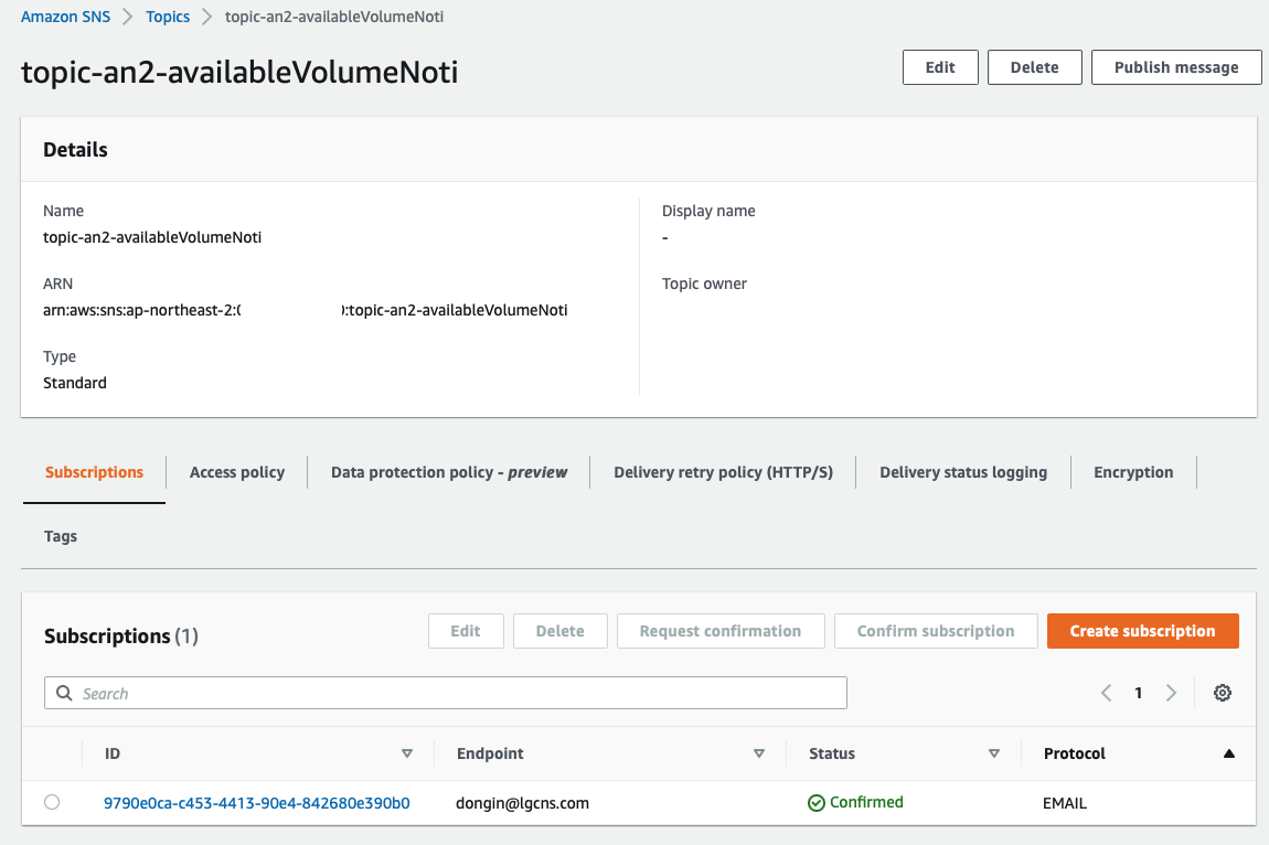 우선 Amazon SNS를 통해 Email로 알람을 받기 위한 SNS Topic을 생성합니다.