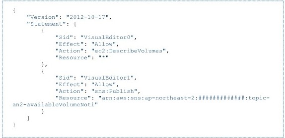 상기 Python 코드가 동작하는 Lambda Funtion이 기능하기 위해서는 EBS(Elastic Block Storage)를 Describe 하고, SNS Topic을 Publish 하는 권한이 필요합니다. 다음 JSON 문은 Lambda Function이 사용하여야 하는 IAM Policy 예제문입니다.