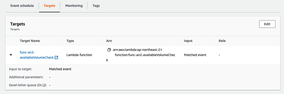 • Target 설정 (이전 Step에서 만든 Lambda Function)