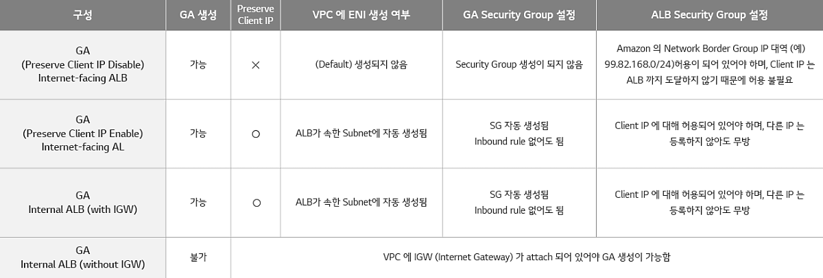 Preserve Client IP 설정에 따라 ALB Subnet에 GA 용 ENI 생성 여부가 결정됩니다. 따라서 ALB가 속한 Subnet에 IP가 부족한 경우, GA 구성이 불가능하므로 사전에 이를 고려하여 설정을 진행해야 합니다.