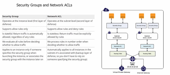 ● Inspection Depth(검사의 깊이) : NACL과 SG는 L3 및 L4 계층에서 동작합니다. 즉 IP 주소, 프로토콜, 그리고 포트에 대해서 적용되며 L7 단은 적용되지 않습니다. 따라서 애플리케이션 계층 기반의 보호를 제공하지 않으므로 예를 들어 HTTP/s 접속에 대한 payload 정보를 기반으로 하는 필터링(특정 URL에 대한 허용/차단 등)을 적용할 필요가 있다면 보안 장비를 추가 구성하여 적용이 가능합니다.