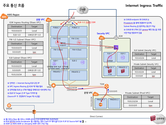 VPC로 인입되는 트래픽에 IGW Ingress Routing을 적용함으로써 인터넷 연결 LoadBalancer(ALB, NLB)에 도달하기 전에 IGW에서 AWS GWLB Enpoint로 트래픽을 전달합니다. GWLB를 사용함에 따라 ELB Sandwich 아키텍처에 존재하던 복잡한 NAT 구성이 필요 없어지며 트래픽 가시성 확보가 가능합니다. 또한, GWLB를 통해 UTM의 가용성 및 확장성 확보가 가능하며, GWLB Endpoint 및 GWLB는 AWS 완전 관리형 서비스로 유연하게 동작합니다.