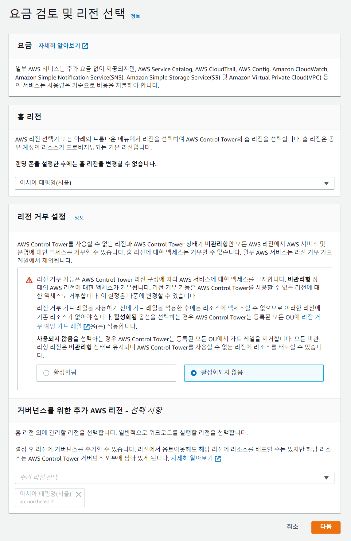 ● 거버넌스를 위한 추가 AWS 리전 : Control Tower에서 관리할 리전을 선택합니다. (수정 가능)