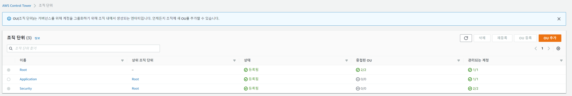 ● 추가 OU : Application OU와 같이 CORE OU를 제외한 용도의 Account가 소속될 OU입니다. 생성 후에 삭제 가능합니다.