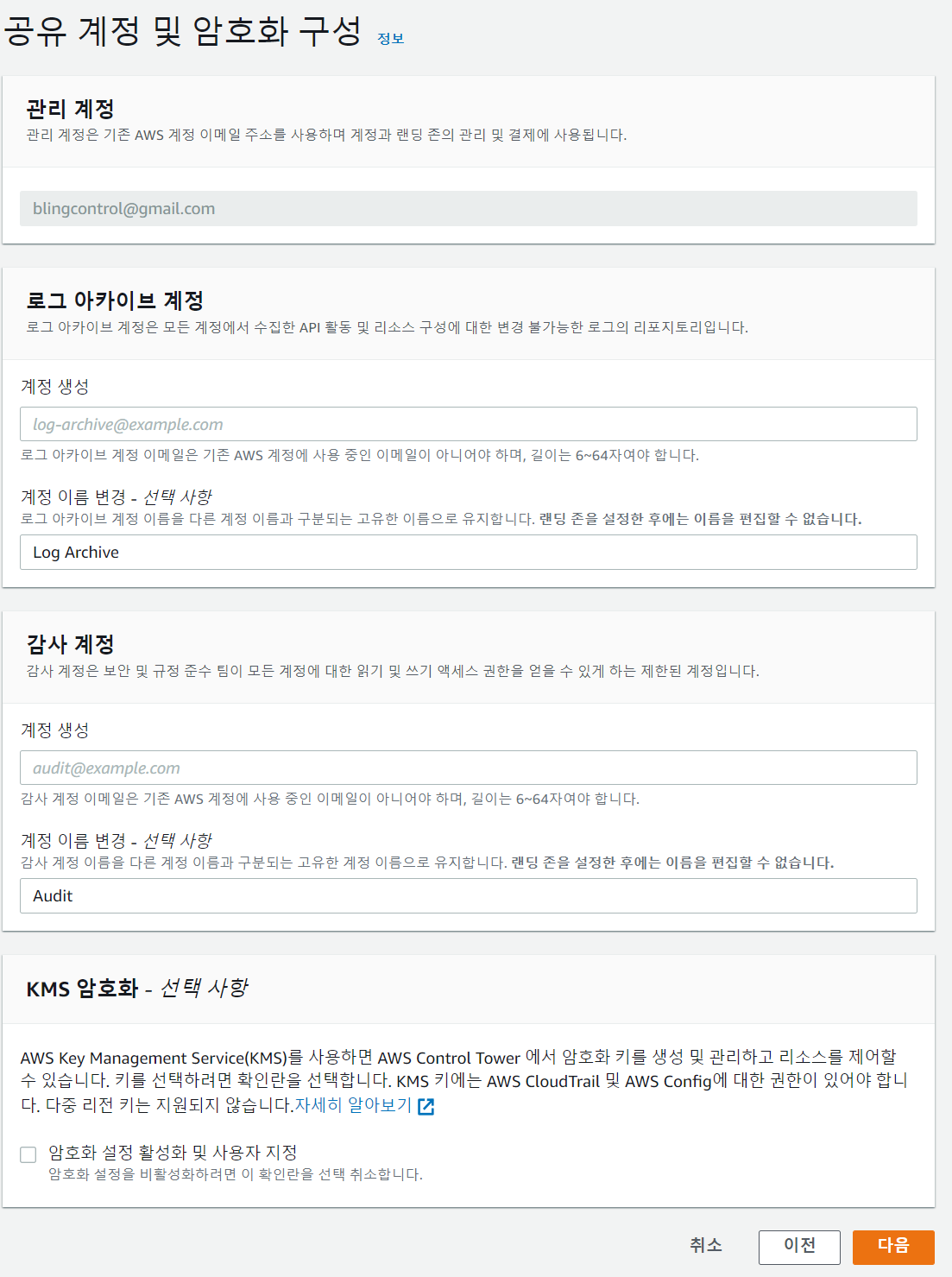 ● 로그 아카이브 계정 : Cloud Trail에 대한 로그를 관리할 Account입니다.