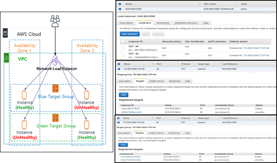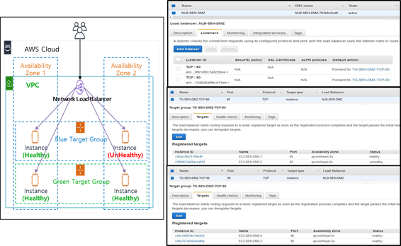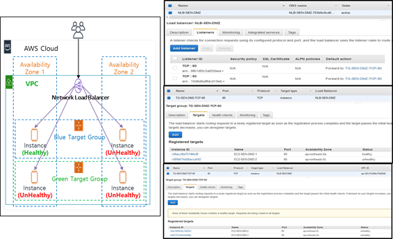 Cross-zone load balancing이 비활성화된 경우, 서비스 사용자는 Healthy인 Target만 존재하는 가용 영역으로 트래픽을 보내며 서비스 제공에 문제가 없습니다. Cross-zone load balancing이 활성화된 경우, 서비스 사용자는 모든 가용 영역으로 트래픽을 보내나 Cross-zone load balancing 동작에 의해 Healthy인 Target이 있는 가용 영역으로 서비스 제공에 문제가 없습니다. (Blue의 경우)