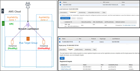 TEST는 아래의 6가지 CASE로 나누어 진행하며, 서비스 사용자는 Network Load Balancer의 DNS Name을 호출하여 얻게 되는 각 가용 영역의 IP로 트래픽을 보내므로, 서비스 이슈 여부는 Network Load Balancer의 DNS Name을 호출한 결과와 Target의 Healthy/Unhealthy 상태로 확인합니다.