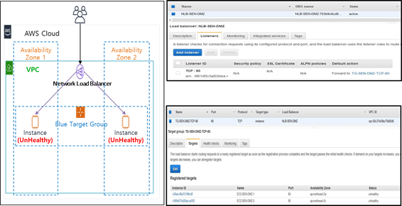 Cross-zone load balancing의 비활성화/활성화 관계없이 서비스 사용자는 모든 가용 영역으로 트래픽을 보내나, 모든 가용 영역의 Target이 Unhealthy 상태이므로 서비스가 불가합니다. (서비스 불가가 정상)