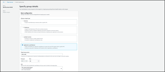 ● Target Group 생성 시 다음과 같이 Application LoadBalancer Type을 선택하며, Application LoadBalancer와 동일한 VPC를 선택합니다.