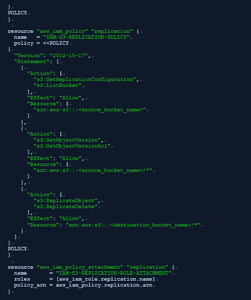 이 Role은 Source Bucket을 읽고 Destination Buket으로 Replication or Delete 가 가능한 Action 들이 포함됩니다.